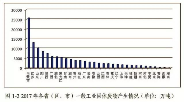 2017年各省(區(qū)、市)一般工業(yè)固體廢物產(chǎn)生情況。資料來源:2018年全國大、中城市固體廢物污染環(huán)境防治年報(bào)