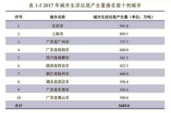 202個(gè)大、中城市,生活垃圾產(chǎn)量居前10位的城市中,生活垃圾產(chǎn)量最大的是北京市,產(chǎn)生量901.8萬噸,其次是上海、廣州、深圳和成都,產(chǎn)生量分別為899.5萬噸、737.7萬噸、604.0萬噸和541.3萬噸。前10位城市產(chǎn)生的生活垃圾總量為5685.8萬噸,占全部信息發(fā)布城市產(chǎn)生總量的28.2%。