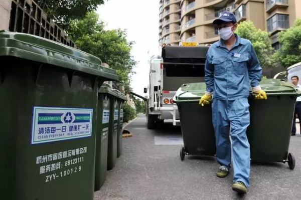 杭州市環(huán)衛(wèi)人員正在當(dāng)?shù)啬承^(qū)回收生活垃圾。攝影/章軻
